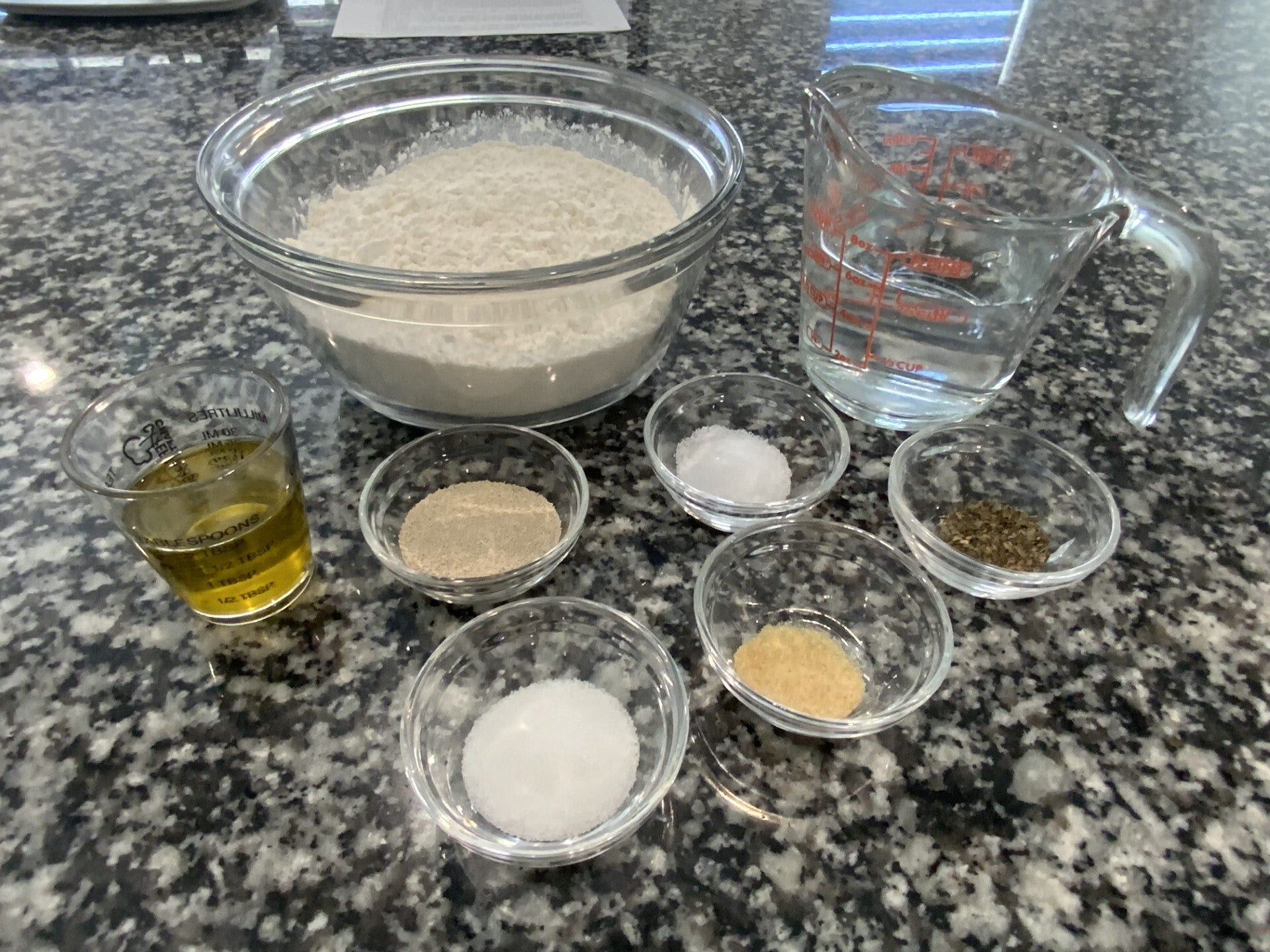 Mix the flour, yeast, sugar, salt, and the seasonings in a large bowl.